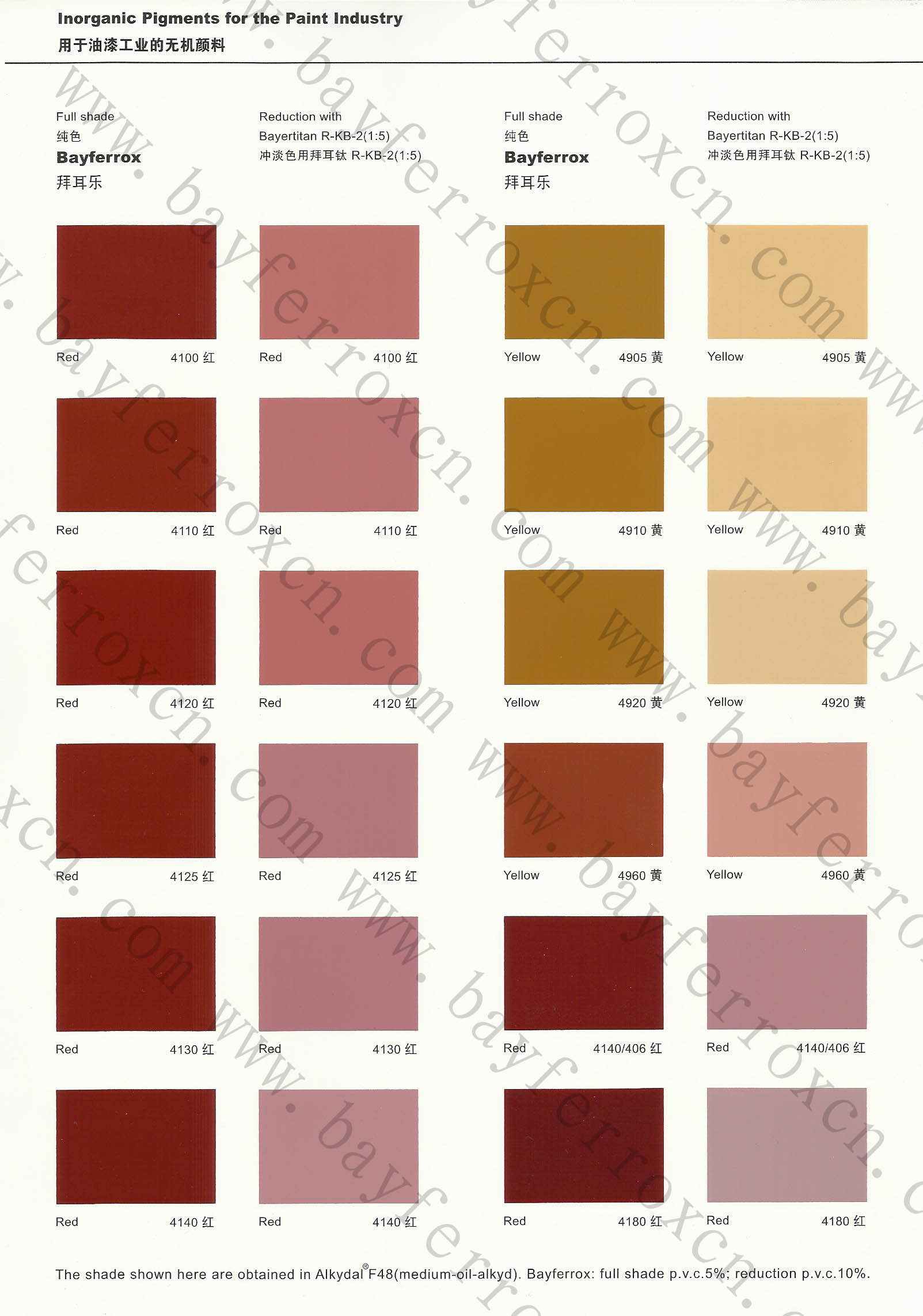 | Bayferrox Red氧化鐵紅 | 4100、4110、4120、4125、4130、4140、4180 | 25KG/包、1000KG/拖盤 | 800-900 |